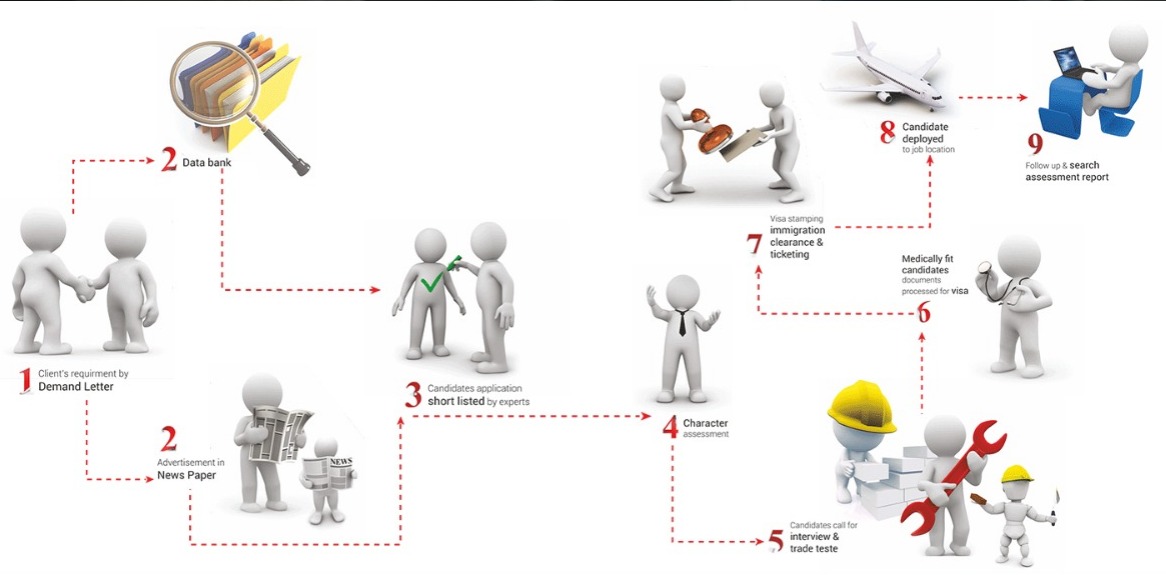 In case of countries where visas are endorsed by their Embassy, we submit passport for endorsement of visas. In some countries where visas are issued by name (individually), thereafter we finalize the selection and then wait for the employer to obtain visas, and all other formalities are completed after the receipt of visas.